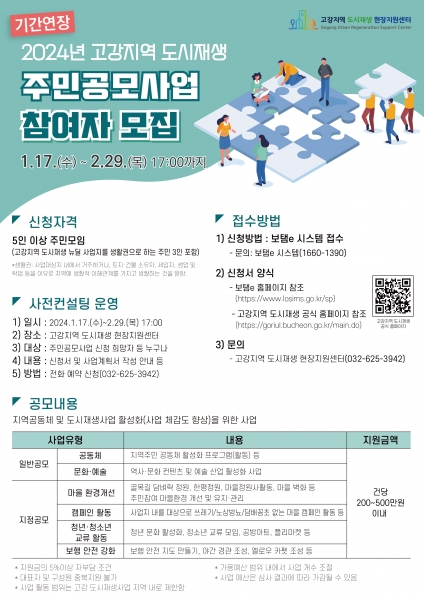 [금요저널] 부천시는 오는 2월 29일까지 고강지역 도시재생 뉴딜사업지역 내의 주민을 대상으로 ‘주민공모사업’ 참가자를 모집한다고 밝혔다.