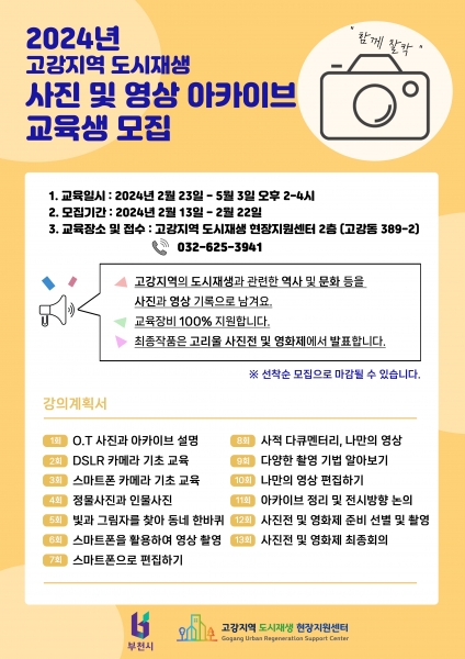 [금요저널] 부천시는 오는 2월 22일까지 ‘2024년 고강지역 도시재생 사진 및 영상 아카이브’ 교육생을 모집한다고 밝혔다.