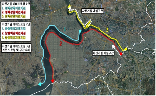 팬데믹 이후 여가이용시민이 증가함에 따라 시민들이 사용하기 쉽고 응급상황에서 출동이 편리하도록 위치 예측이 가능한 도로명이 필요함에 따라, 평택시를 동에서 서로 가로지르는 평택호순환자전거1길, 2길, 안성천자전거1길, 2길에 대해명칭 및 구간을 변경해 평택강북자전거길, 평택강남자전거길, 평택강동자전거길 등 3개 구간으로 변경에 대한 주민 의견을 2월 15일부터 3월 8일까지 22일간 받는다.