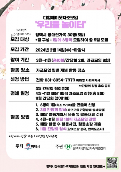 평택시장애인가족지원센터, 2024년 다함께이웃자조모임 ‘우리들 놀이터’ 참여자 모집