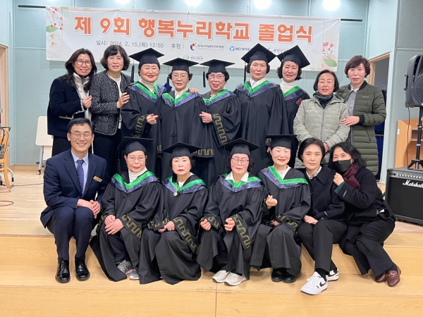 이날 행복누리학교 졸업식에는 초등반 6명과 중등반 3명 총 9명의 어르신이 졸업장을 받았으며 졸업생과 가족 및 동료 등 80여명이 참석해 함께 기쁨을 나눴다.