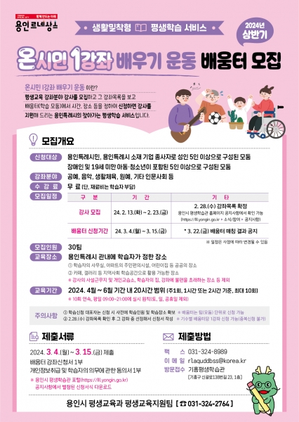 [금요저널] 용인특례시는 다음 달 4일부터 15일까지 ‘2024년 상반기 온 시민 1강좌 배우기 운동’에 참여할 배움터를 모집한다고 16일 밝혔다.