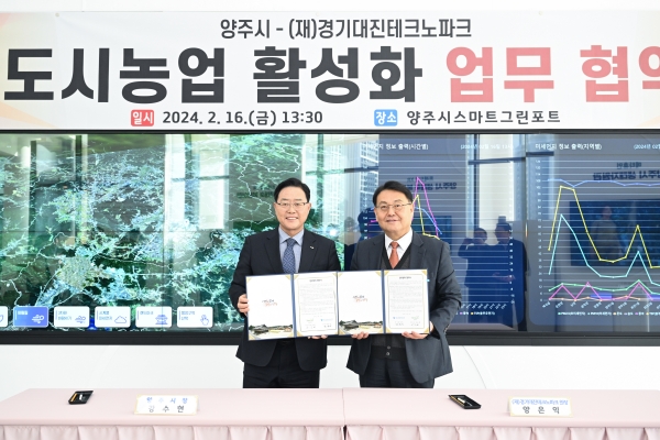[금요저널] 강수현 양주시장은 16일 오후 ‘경기대진테크노파크’와 ‘스마트 그린포트를 활용한 도시농업 활성화 업무협약’을 체결했다.