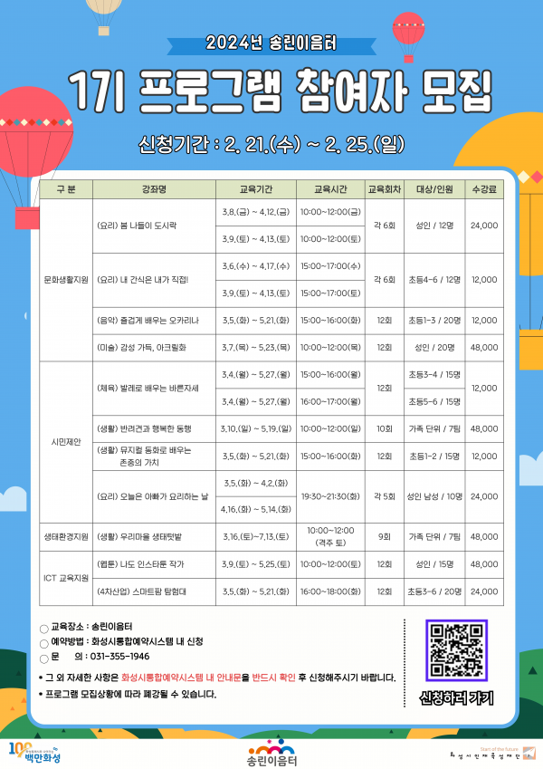 1기 프로그램의 운영기간은 3월부터 5월까지이며 접수 기간은 2월 21일 10시부터 2월 25일 오후 5시까지로 화성시 통합예약시스템을 통해 신청하면 된다.