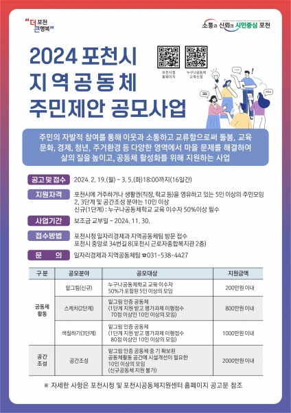 [금요저널] 포천시는 오는 3월 5일까지 지역의 문제를 주민 스스로 해결하고 더 살기 좋은 삶터를 만들기 위한 ‘2024년 지역공동체 주민제안 공모사업’ 참여 공동체를 모집한다.