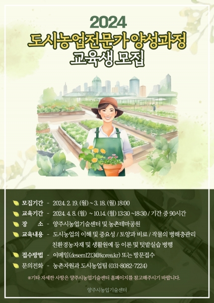[금요저널] 양주시는 다음달 18일까지 도시농업 활성화를 이끌 도시농업 선도 전문인력 양성을 위한 ‘도시농업전문가 양성과정’에 참여할 교육생을 모집한다고 19일 밝혔다.