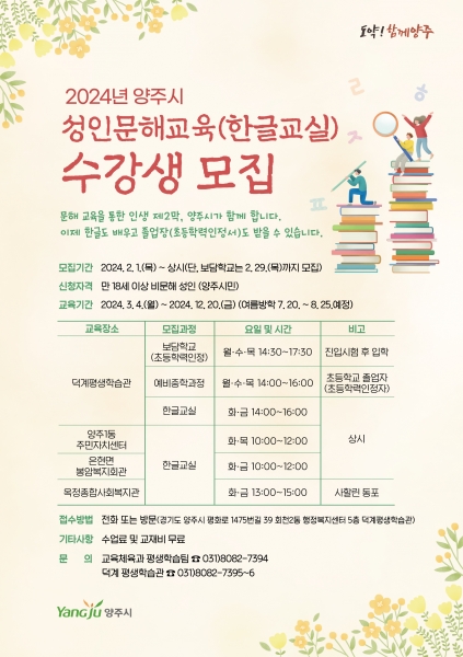 [금요저널] 양주시가 배움의 기회를 놓친 시민들을 대상으로 기초학습 능력 강화와 삶의 질 향상 기회를 제공하고자 ‘2024년 성인문해교육 프로그램’ 수강생을 모집한다고 19일 밝혔다.
