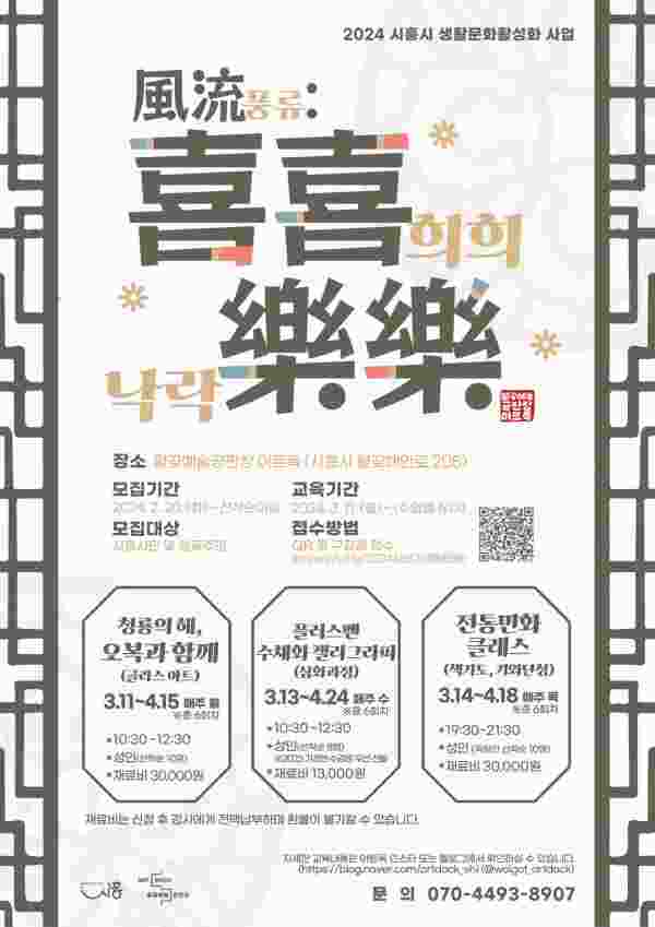 [금요저널] 시흥시는 오는 3월 11일부터 4월 24일까지 월곶예술공판장 아트독에서 2024년 상반기 생활문화프로그램인 ‘풍류-희희낙락’을 운영한다.
