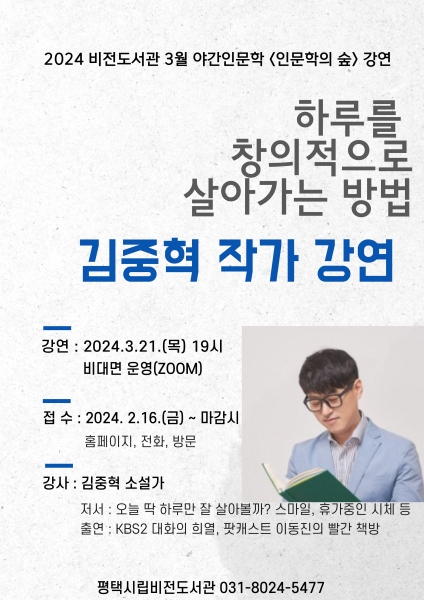[금요저널] 평택시 비전도서관이 오는 3월 21일 목요일 저녁 7시 ‘오늘 딱 하루만 잘 살아 볼까?’ 김중혁 작가 강연을 비대면으로 진행한다.