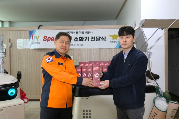 [금요저널] 용인소방서는 20일 용인특례시 지역 내 안전인프라 구축을 위해 화재 초기진화 소화용구 ‘스프레이식 액상 소화기’를 ㈜에치와이에 전달했다고 밝혔다.