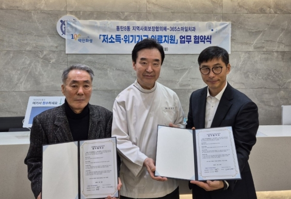 [금요저널] 동탄8동 지역사회보장협의체가 20일 365스마일 치과 및 바르다임 병원과 ‘저소득·위기가구를 위한 의료지원 업무협약’을 체결했다.