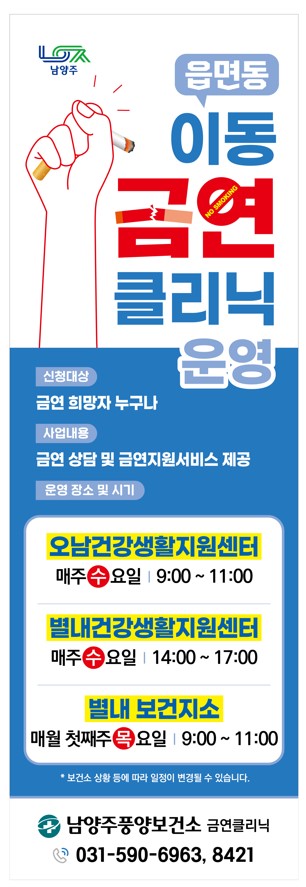 [금요저널] 남양주풍양보건소는 오는 3월부터 읍·면·동 찾아가는 이동 금연클리닉을 상설 운영해 거리 제약으로 접근이 어려운 금연 희망자들에게 금연상담 및 금연지원서비스를 제공한다.