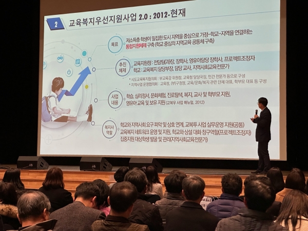 행사는 ‘교육복지우선지원사업 3.0 – 과거, 현재, 그리고 미래’를 주제로 한 이상돈 부교육감의 기조 강연을 시작으로 2024년 사업 기본계획 안내, 운영 사례 공유 순으로 진행했다.