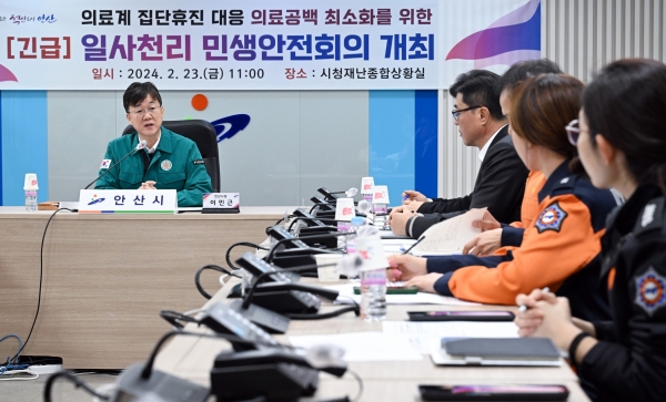 안산시는 23일 오전 이민근 시장 주재로 안산시, 경기남부경찰청·단원경찰서·상록경찰서·안산소방서가 함께 의료계 집단휴진 대응에 따른 의료공백 최소화를 위한 긴급 일사천리 민생안전회의를 개최했다고 밝혔다.