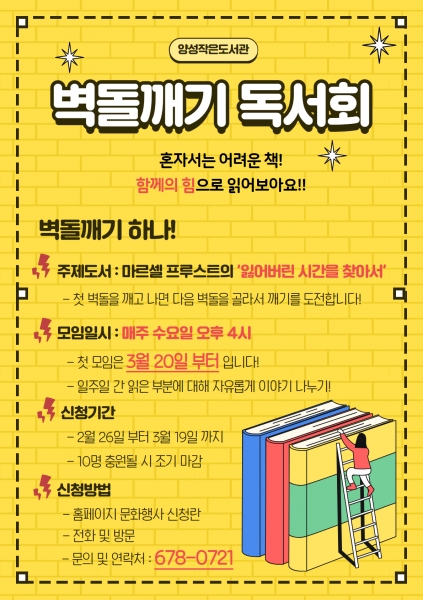 [금요저널] 안성시 양성작은도서관은 2월 27일부터 ‘벽돌깨기 독서회’의 참가자를 모집한다.