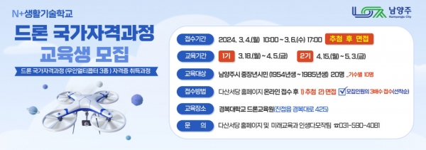 [금요저널] 남양주시는 오는 3월 4일부터 6일까지 이른 퇴직으로 어려움을 겪는 중장년 세대를 지원하기 위해 맞춤형 기술교육인 N+생활기술학교 드론 국가자격과정 교육생을 모집한다.