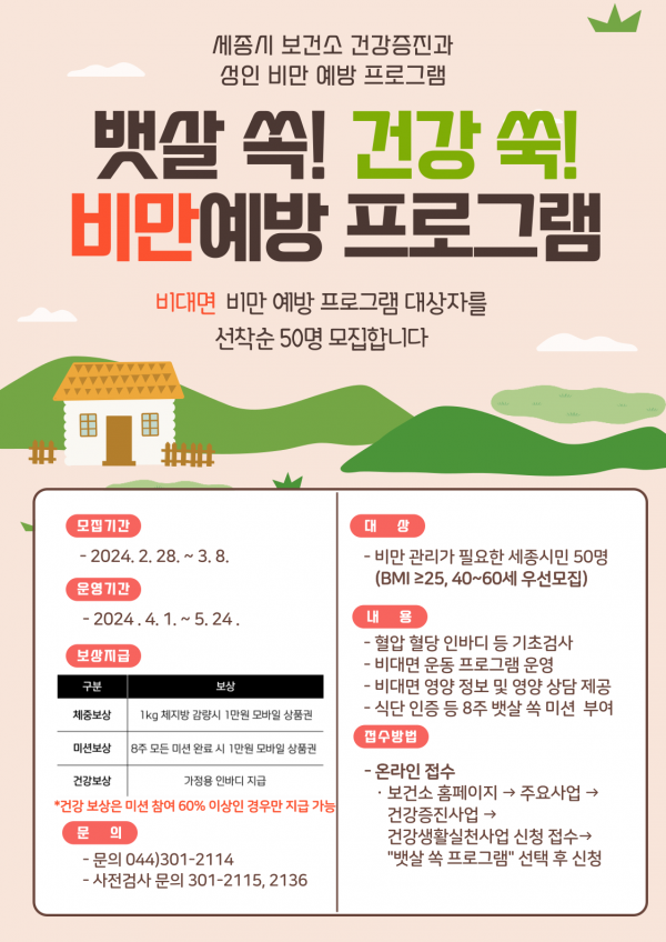 [금요저널] 세종특별자치시 보건소가 성인 비만 예방·관리를 위한 ‘뱃살 쏙 건강 쑥’ 비대면 프로그램을 운영한다.