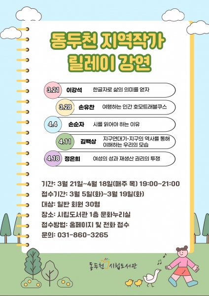 [금요저널] 동두천시 평생교육원 시립도서관은 3월 21일부터 4월 18일까지 ‘지역작가 릴레이 강연’을 진행한다고 밝혔다.