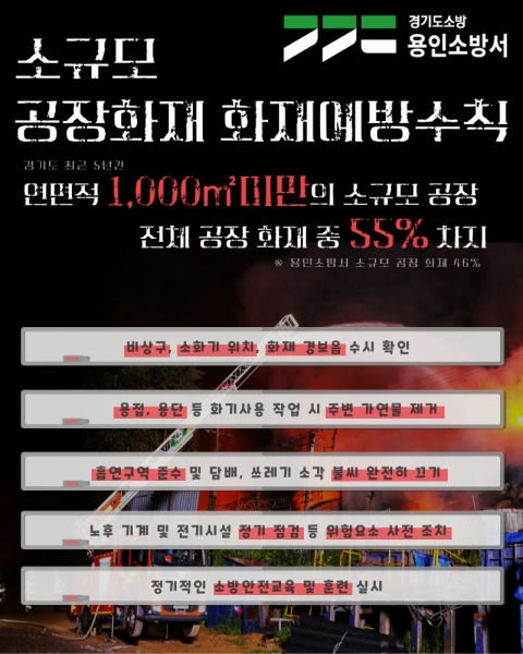 경기도에서 최근 5년간 전체 공장화재 중 55%에 달하는 2,366건이 소규모 공장에서 발생한 화재로 조사됐으며 용인특례시에는 최근 5년간 공장화재 중 46%가 연면적 1,000㎡미만의 소규모 공장에서 화재가 발생한 것으로 나타났다.