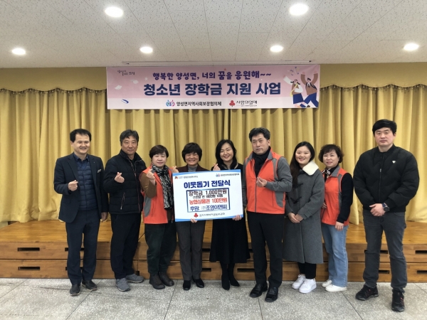 이번 진행된 장학금 전달식은 양성면 아동·청소년에게 건강한 성장과 미래에 대한 희망을 지원하기 위해 주)조영이앤씨의 지정기탁금으로 경기도사회복지공동모금회를 통해 양성면 초·중등학생 10명에게 농협기프트카드 10만원권과 2024년 3월부터 2024년 12월까지 10개월간 매월 10만원씩 지원될 예정이다.