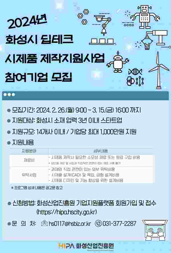 [금요저널] 화성산업진흥원은 미래를 이끌어갈 딥테크 스타트업들의 성공적인 시장 안착과 스케일업을 위해 ‘2024년 화성시 딥테크 시제품 제작지원사업'을 마련하고 오는 3월 15일까지 참여기업을 모집한다.