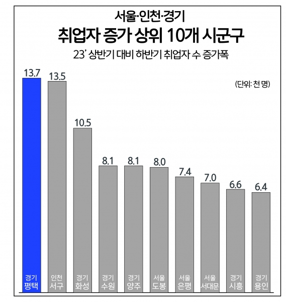 같은 기간 수도권에서 취업자 증가 폭이 1만명을 넘은 시군구는 단 3곳으로 인천 서구, 경기 화성시가 평택시 뒤를 이었다.
