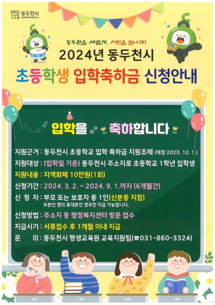 동두천시, “2024년도 초등학생 입학축하금 신청하세요”