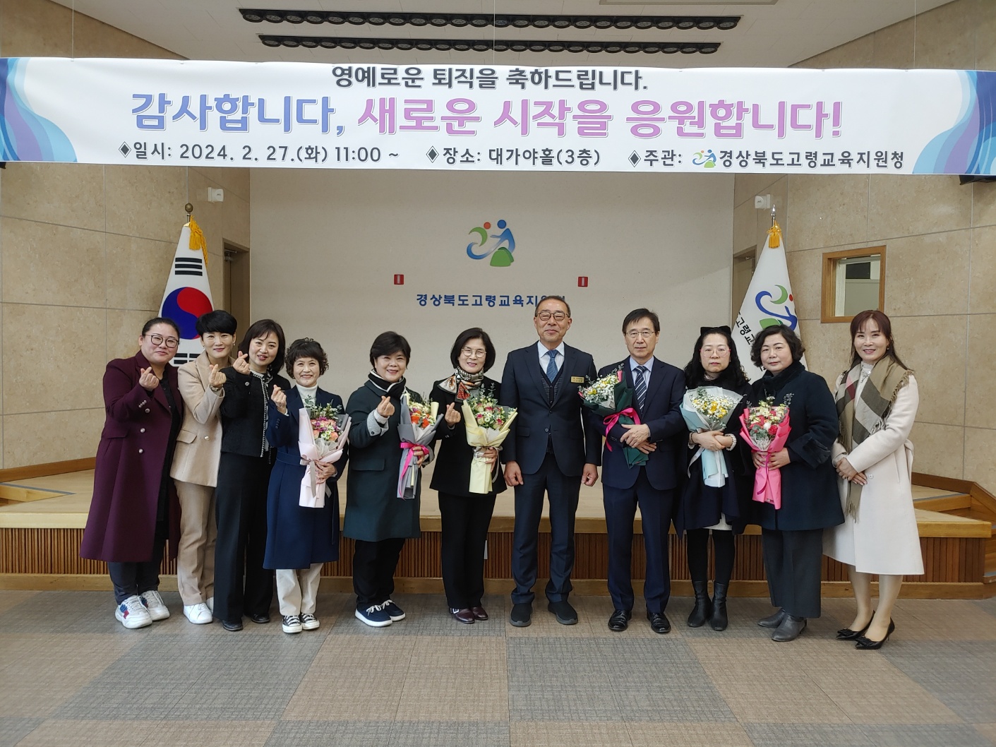 경상북도고령교육지원청(교육장 김호상)은 2월 27일 (화) 고령교육지원청 대가야홀에서 2024년 2월 말 교육공무원 퇴직 교원 축하의 자리를 마련하였다. 이번 행사는 교육장 인사를 시작으로 임용장 수여, 꽃다발 및 소정의 선물 증정, 기념 촬영 순으로 진행되었다.