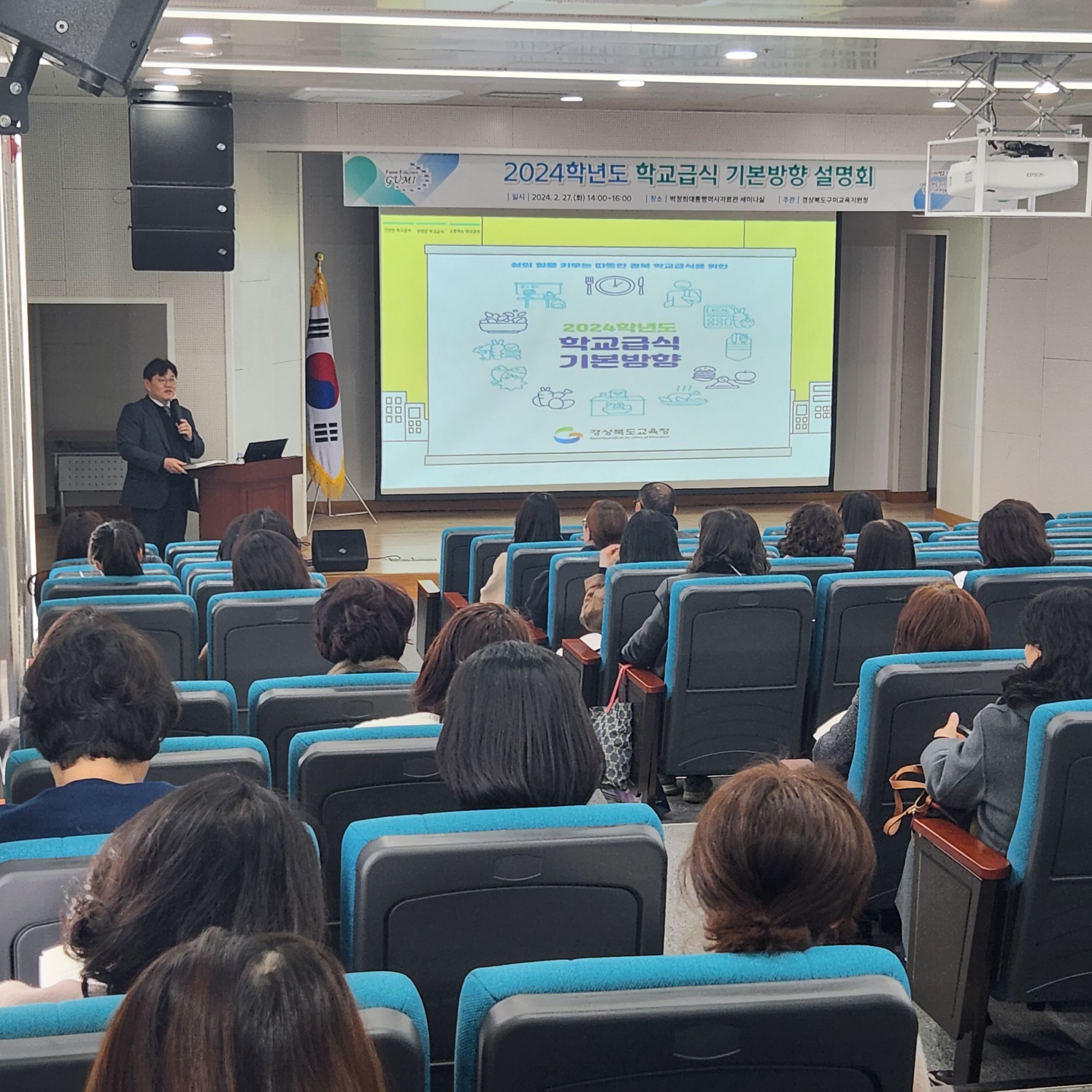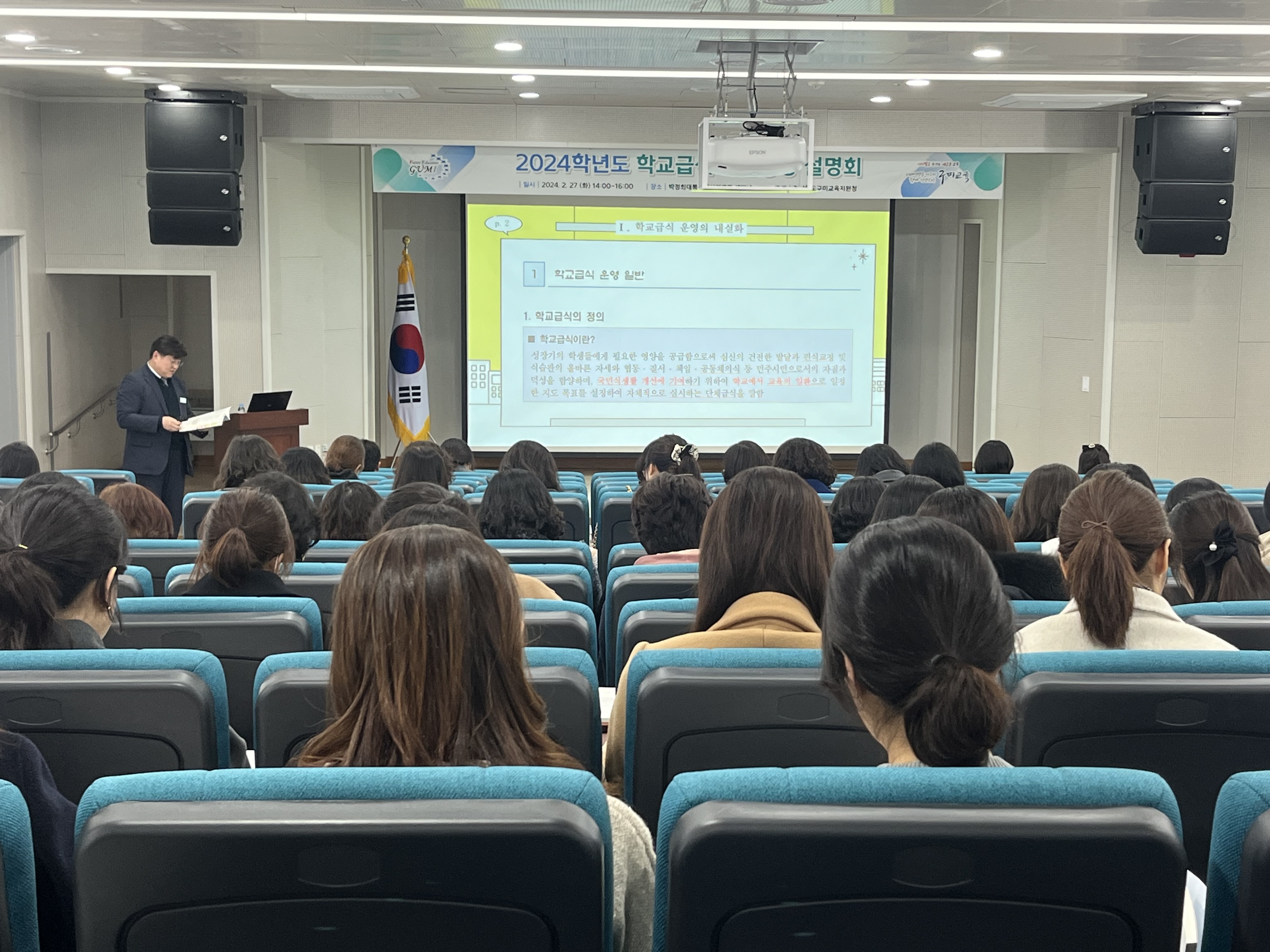 ❑ 경상북도구미교육지원청(교육장 이성희)은 지난 27일 박정희대통령역사문화관 세미나실에서 관내 각급학교 영양(교)사 110여명을 대상으로 2024학년도 학교급식 기본방향 설명회를 개최하였다.
