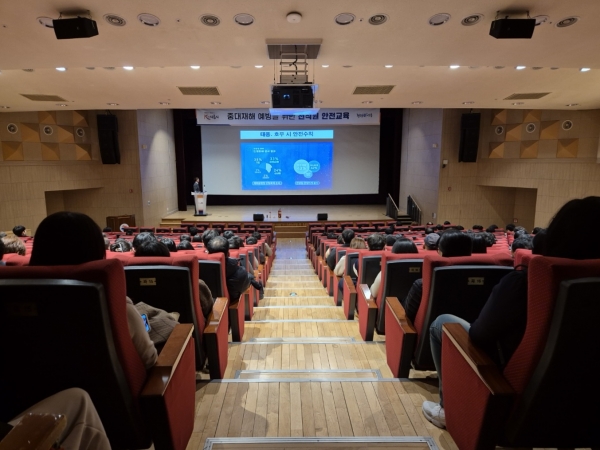 전 행정안전부 국가민방위재난안전교육원 교수를 초빙해 열린 교육은 ▲재난 대응 행동 요령 ▲현장 중심의 안전보건관리체계 구축 ▲주요 재난유형별 유해·위험 요인 파악 및 대책 수립 등의 내용으로 구성됐다.