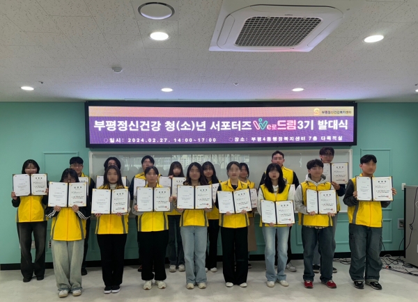 박광희 부평정신건강복지센터장은 “서포터즈 활동이 청년 및 청소년층의 정신건강에 대한 관심을 높이고 정신질환을 예방·대처하는데 긍정적인 역할을 할 것“이라며 “특히 MZ세대의 감각적인 다양한 활동들이 기대된다”고 전했다.