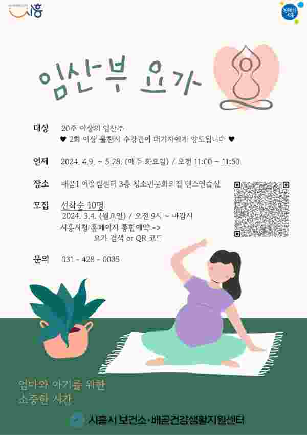 분만에 좋은 호흡법, 순산 요가, 산후 회복에 좋은 동작 등 건강한 출산 및 회복을 위한 프로그램으로 구성됐으며 3월 4일부터 시흥시 통합예약 사이트를 통해 신청하면 된다.
