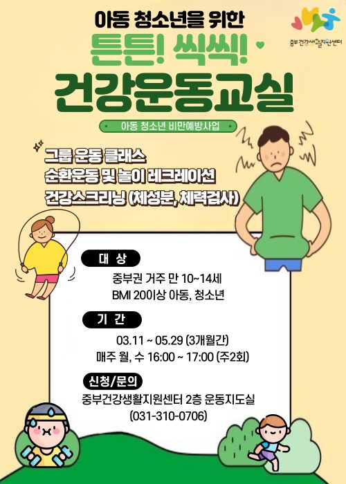 정성근 중부건강생활지원센터장은 “운동프로그램을 통해 아동·청소년의 신체 능력 향상은 물론, 다양한 건강관리 프로그램을 연계해 아동·청소년의 과체중과 비만율을 줄이고 이들의 건강 수준을 높여나가겠다”고 밝혔다.