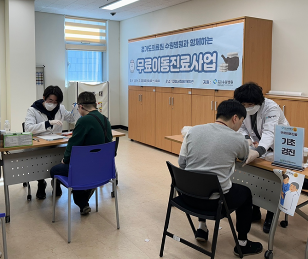 한편 무료이동진료 사업은 경기도의 수탁을 받아 경기도의료원 수원병원에서 운영하는 사업이며 무료이동진료팀이 직접 방문해 의료소외계층과 의료취약지역 주민을 대상으로 1차적 건강상태 확인 및 진료, 의료상담을 통해 전인적인 의료서비스를 무료로 제공하는 서비스이다.