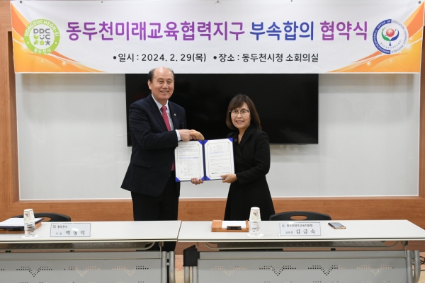 [금요저널] 동두천시는 29일 시청 소회의실에서 박형덕 동두천시장 및 김금숙 동두천양주 교육지원청 교육장이 참석한 가운데 ‘2024년 동두천미래교육협력지구 부속합의 협약’을 체결했다.