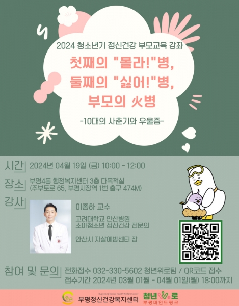 교육 신청은 다음 달 1일까지 전화 또는 포스터의 큐알코드로 가능하며 자세한 내용은 부평정신건강복지센터로 문의하면 된다.