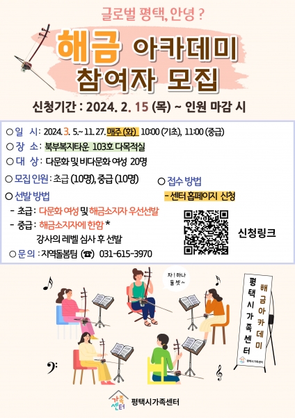 [금요저널] 평택시가족센터가 오는 5일 ‘글로벌 평택, 안녕? 해금아카데미’를 개강한다.