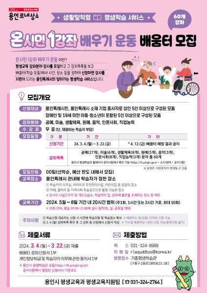 [금요저널] 용인특례시는 오는 22일까지 ‘2024년 온시민 1강좌 배우기 운동’에 참여할 배움터를 모집한다고 5일 밝혔다.