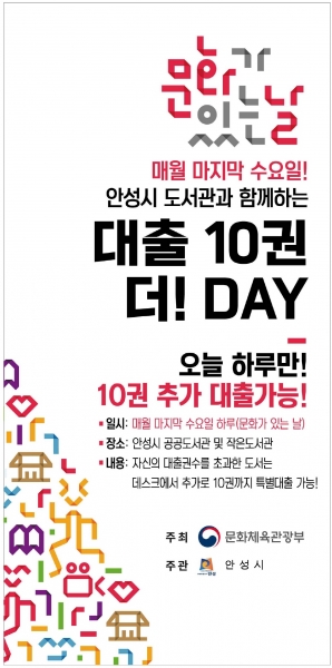 따라서 ‘문화가 있는 날’인 매월 마지막 수요일에는 안성시 도서관 16개관에서 본인의 대출권수 한도보다 10권을 더 추가로 대출할 수 있다.