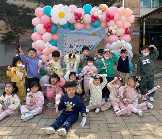 □ 입학식은 만3, 4, 5세 유아들이 오전 10시에 경산압량초등학교 시청각실에 모여 진행하였으며, 국민의례와 입학허가 선언, 원장 인사, 입학 기념 꽃 전달, 샌드아트 및 마술공연 순으로 진행하였다.