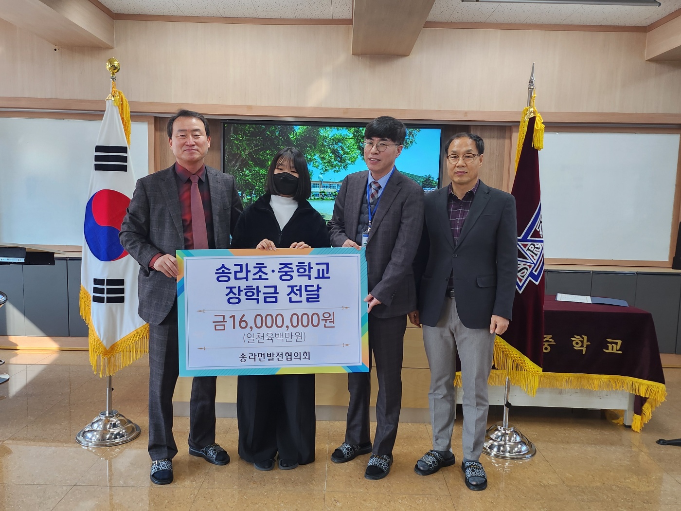송라면 발전협의회 회장 윤○○은 송라중학교 전교생에게 장학금 50만원씩을 전달하며 꿈을 갖고 지역인재로 훌륭하게 성장하길 바란다며 학생들을 격려하였다.