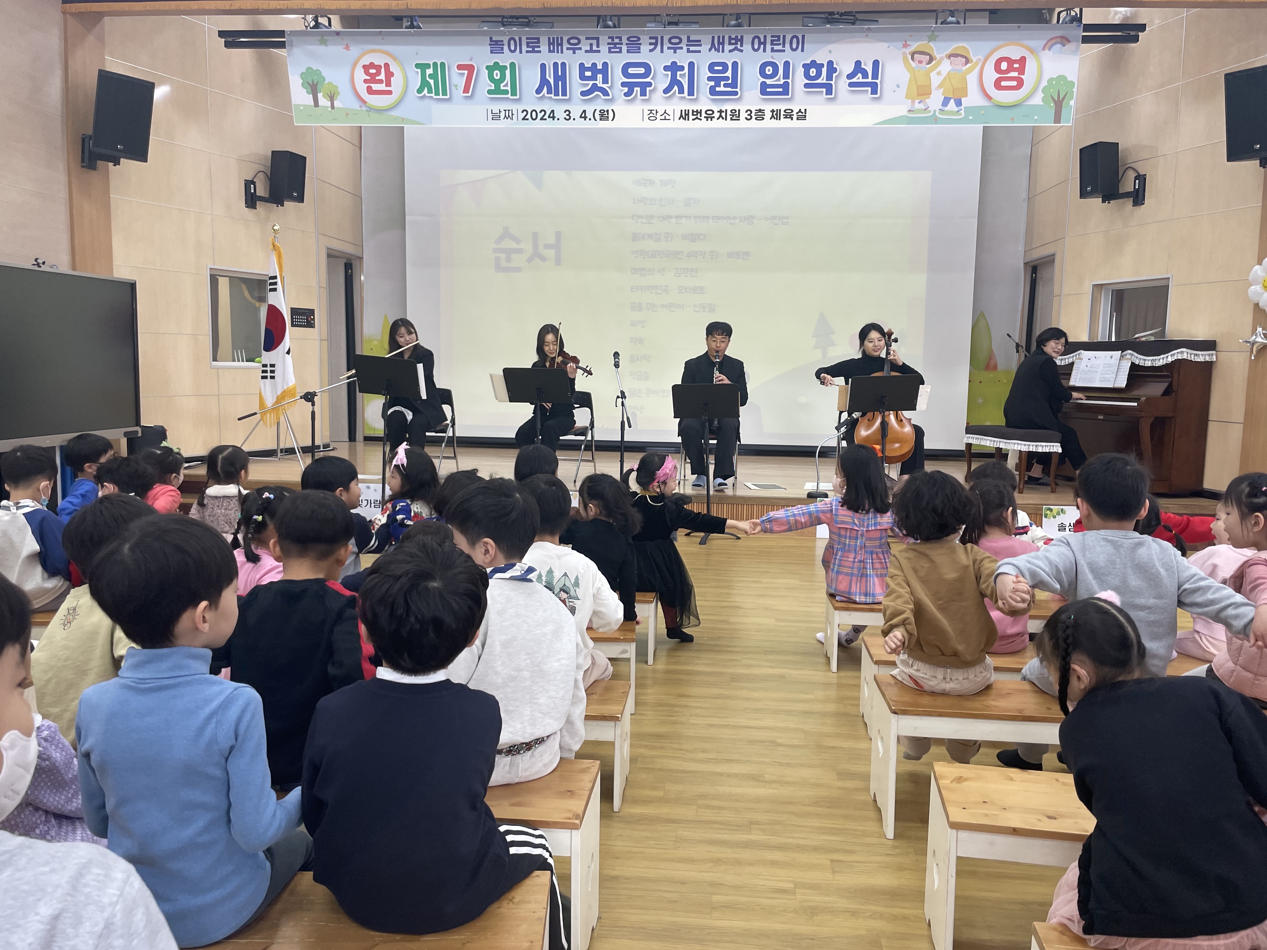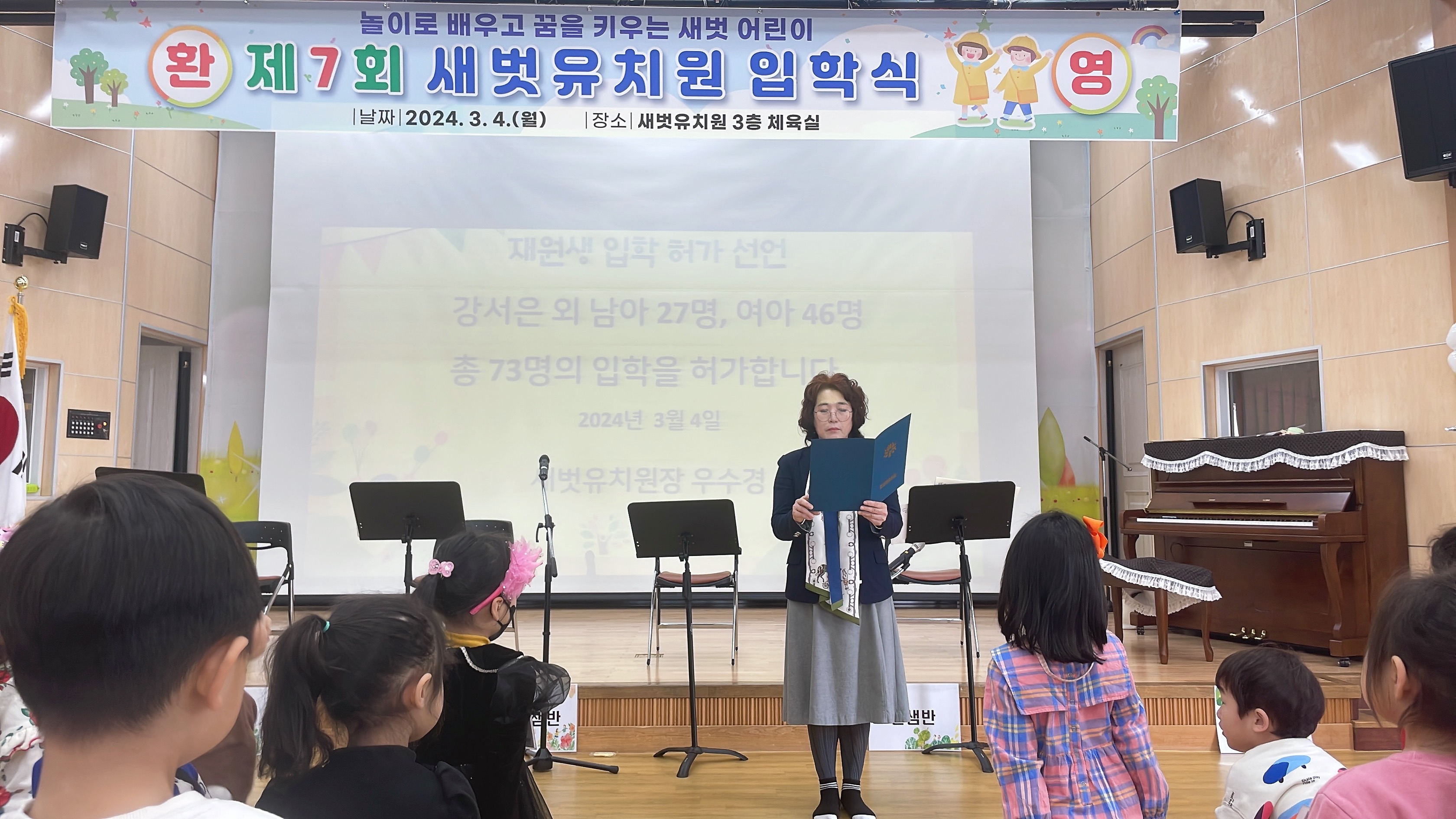 □ 새벗유치원(원장 우수경)은 3월 4일(월) ‘제7회 입학식’을 개최했다. 입학식은 재원생과 신입생을 포함한 총 원아 122명과 신입생 학부모를 대상으로 두 번에 걸쳐 진행되었다.