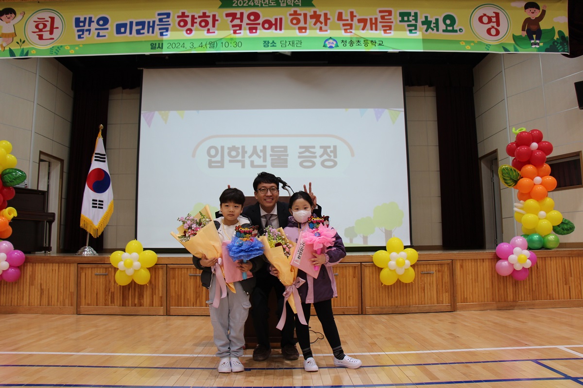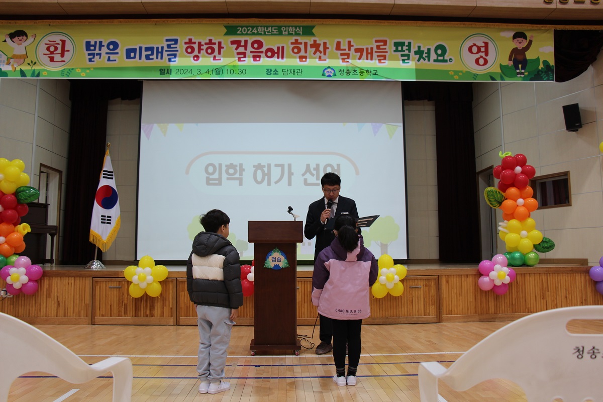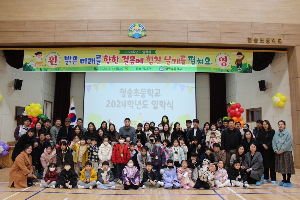 □ 청송초등학교(교장 허영희)는 3월 4일(월) 10시 30분, 담재관에서 입학생 38명과 학부모 및 6학년 학생들이 참석한 가운데 입학식을 개최하였다.