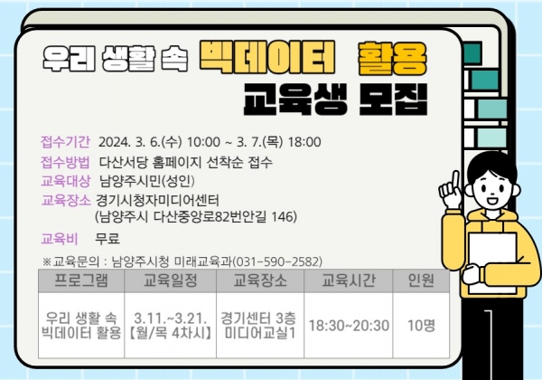 이달 6일 우리 생활 속 빅데이터 활용 1기 교육 접수를 시작으로 11월까지 경기시청자미디어센터에서 매월 교육이 진행되며 남양주시에 거주하는 성인은 누구나 무료로 신청할 수 있다.