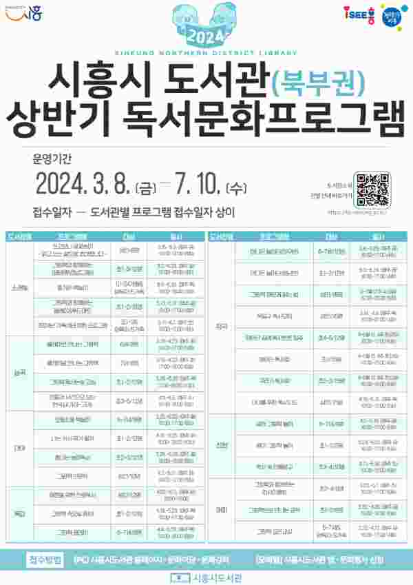 [금요저널] 시흥시 소래빛도서관을 비롯한 북부권의 7개 공공도서관이 3월 8일부터 7월 10일까지 상반기 정기 독서문화 프로그램을 운영한다.