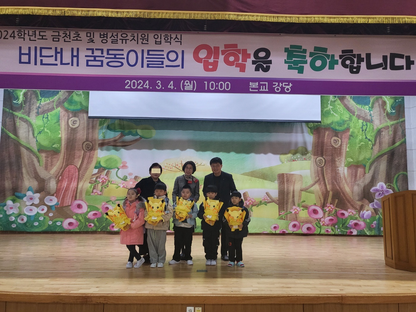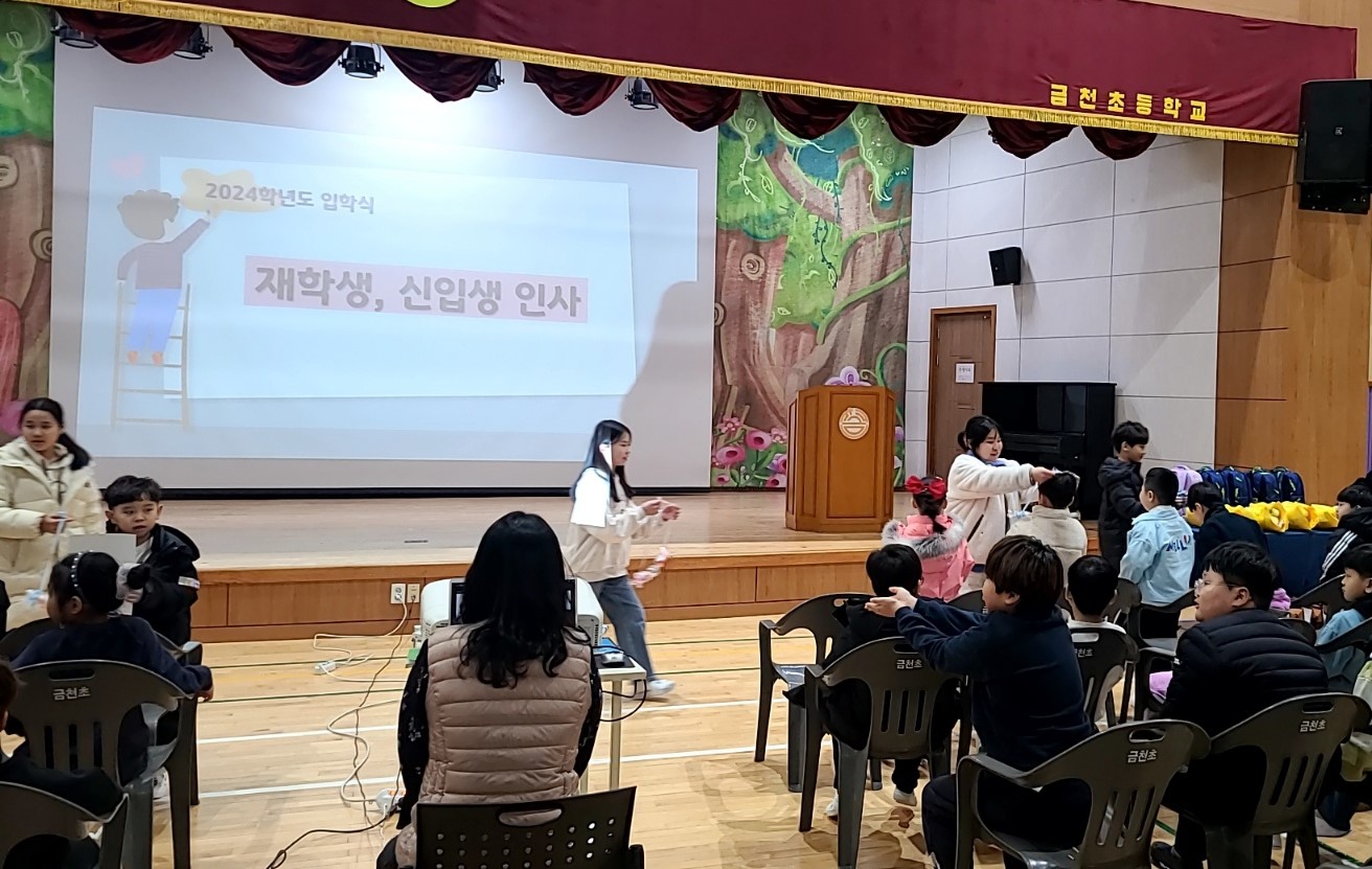 금천초등학교(교장 한미경)는 3월 4일(월), 어울림터(강당)에서 선생님들과 학부모, 재학생들의 축하 속에서 2024학년도 금천초등학교 및 병설유치원의 입학식을 가졌다.