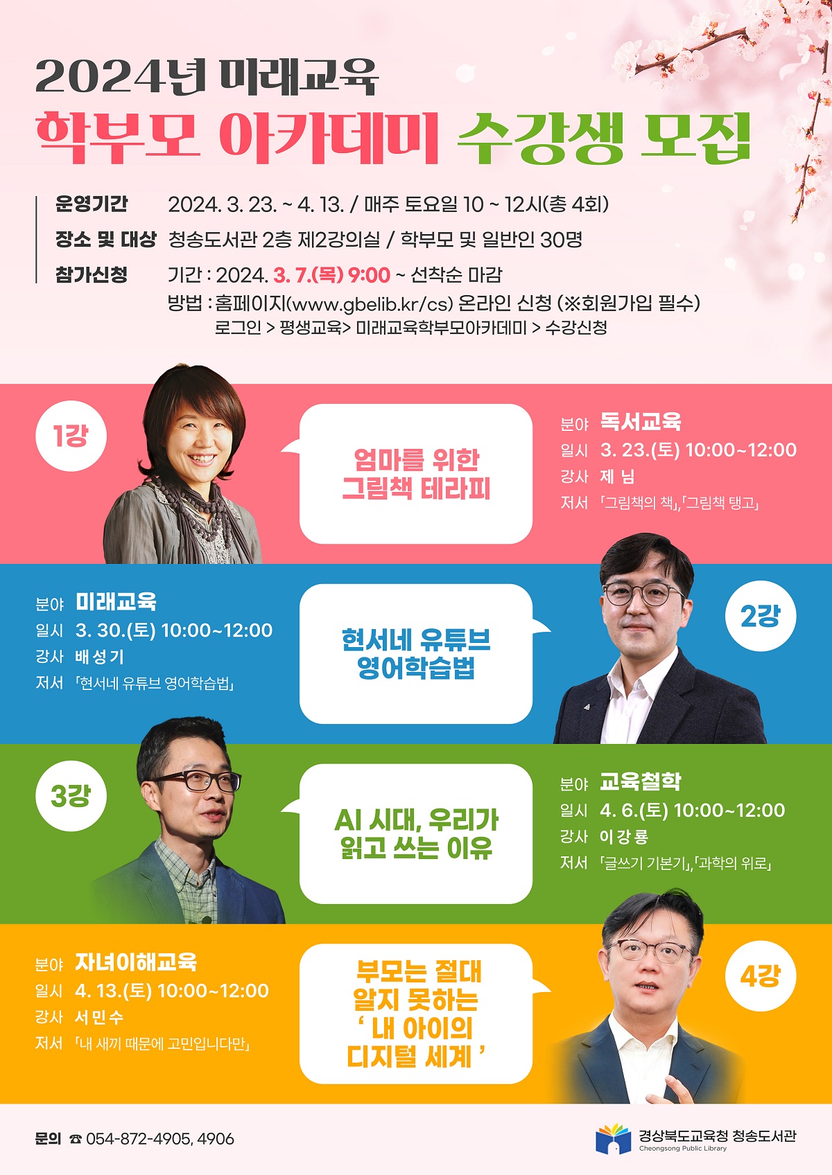 올해 청송도서관 미래교육 학부모 아카데미는 각 분야 교육 전문가들을 초청해 그림책 지도, 영어 교육, 글쓰기 및 과학 교육, 디지털 리터러시 등의 충실한 주제로 부모 교육 과정을 운영한다. △제님 작가의 ‘엄마를 위한 그림책 테라피’△배성기 작가의 ‘현서네 유튜브 영어학습법’ △이강룡 작가의 ‘AI시대, 우리가 읽고 쓰는 이유’△서민수 작가의 ‘(부모는 절대 알지 못하는)내 아이의 디지털 세계’강의로 학부모들에게 깊이 있는 정보를 제공할 예정이다.