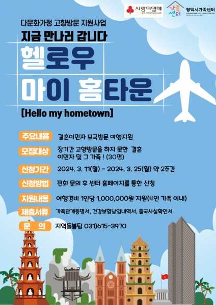 [금요저널] 평택시가족센터는 오는 11일부터 다문화가족 고향 방문 지원 사업 ‘지금 만나러 갑니다, 헬로우 마이 홈타운’ 참여자를 모집한다.