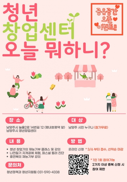 [금요저널] 남양주시는 3월 한 달 동안 청년창업센터 3~4층 공유공간에서 시민 누구나 무료로 참여하고 즐기는 다양한 이벤트를 실시한다고 6일 밝혔다.