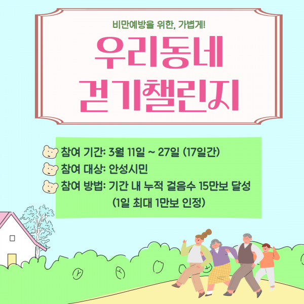 걷기는 일상생활에서 실천 가능하며 공간과 인원 제약이 없는 운동으로 안성시보건소는 시민 건강증진에 일조하고자 모바일 걷기 앱을 통해 지속적으로 챌린지를 운영하고 있다.
